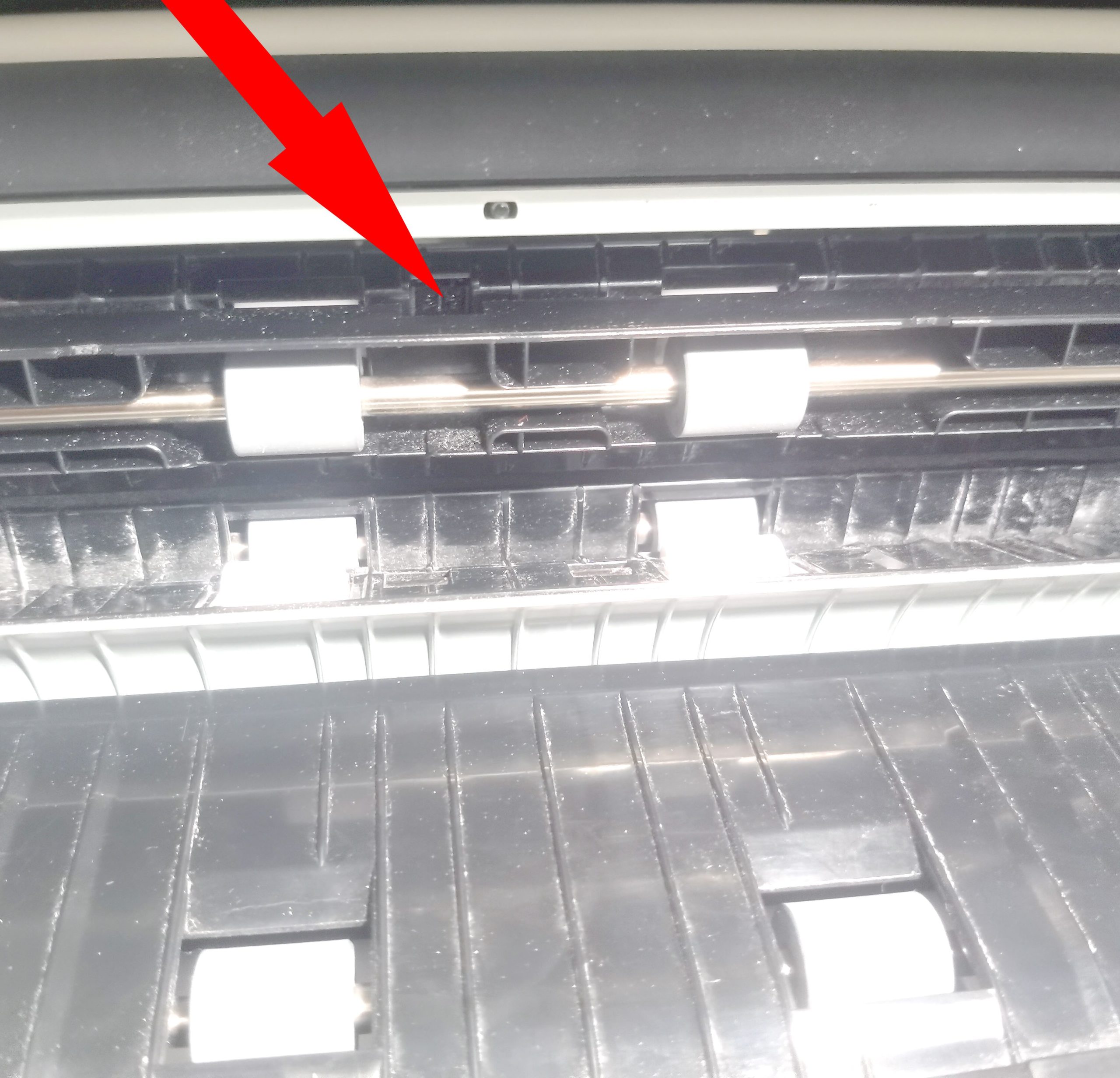 Punase noole tipus on viidatud sensorile (kaks klaassilma) mis tuleks suruõhuga puhastada paberitolmust kui antud piirkonnas (printeri paremal küljel) esineb paberiummistusi.